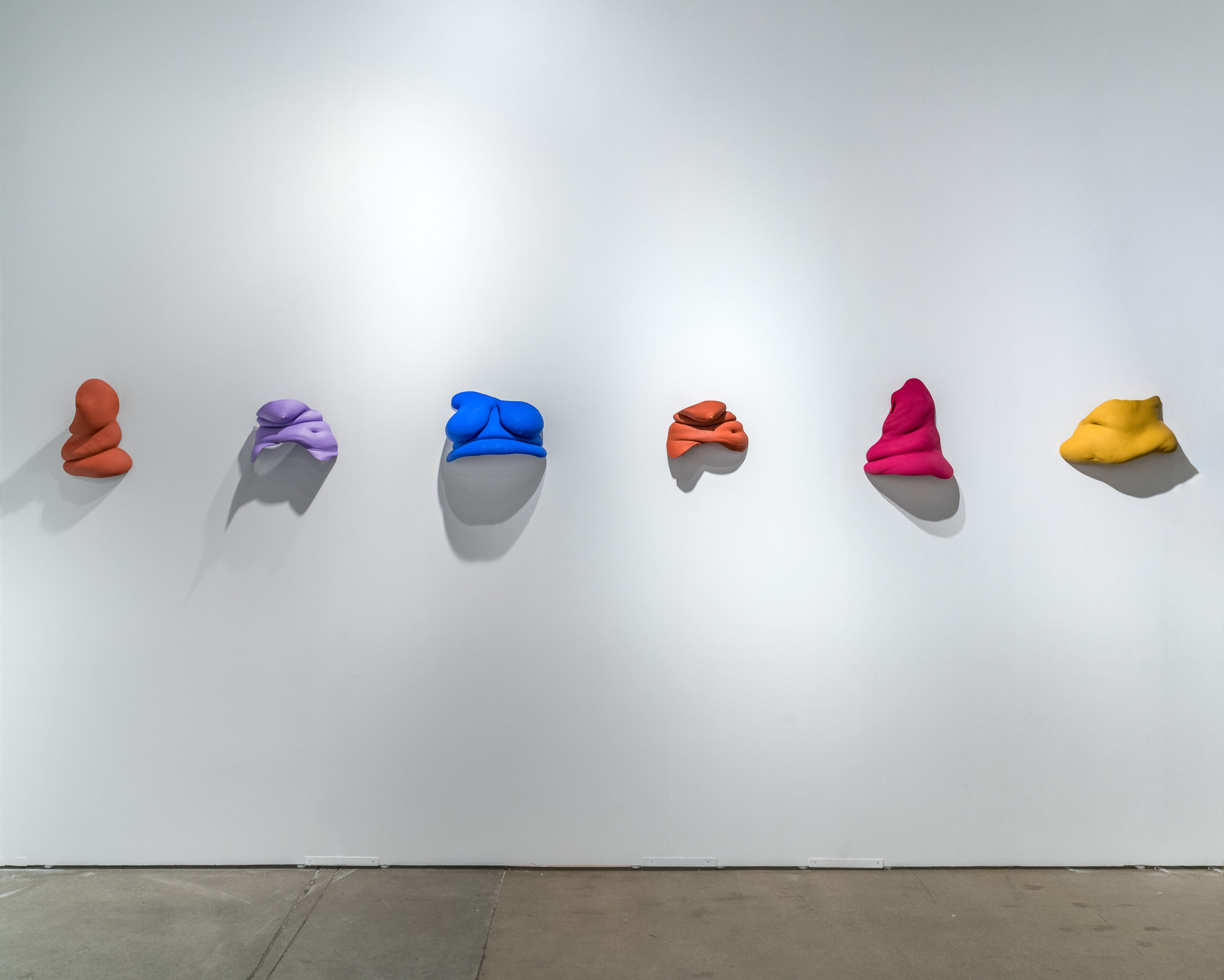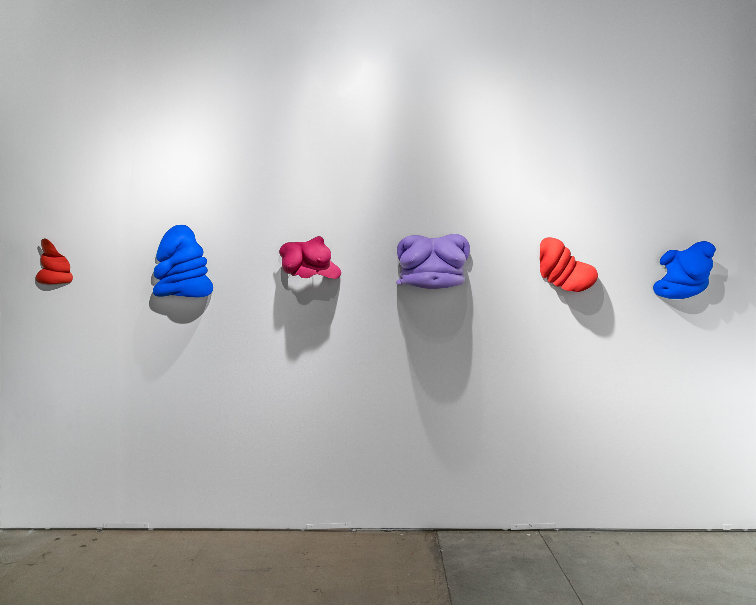 Sculpted with smooth edges and in bright colors—brilliant shades of blue, lavender, ochre, and red—these casts offer a vision of a body that is joyful, leisurely, and playful, refusing to be concealed by slimming shades, insisting that they are enough exactly as they are. Shifting their orientation, Japanwala abstracts these figures without augmenting them, beholding each body as if it was a majestic stretch of earth.