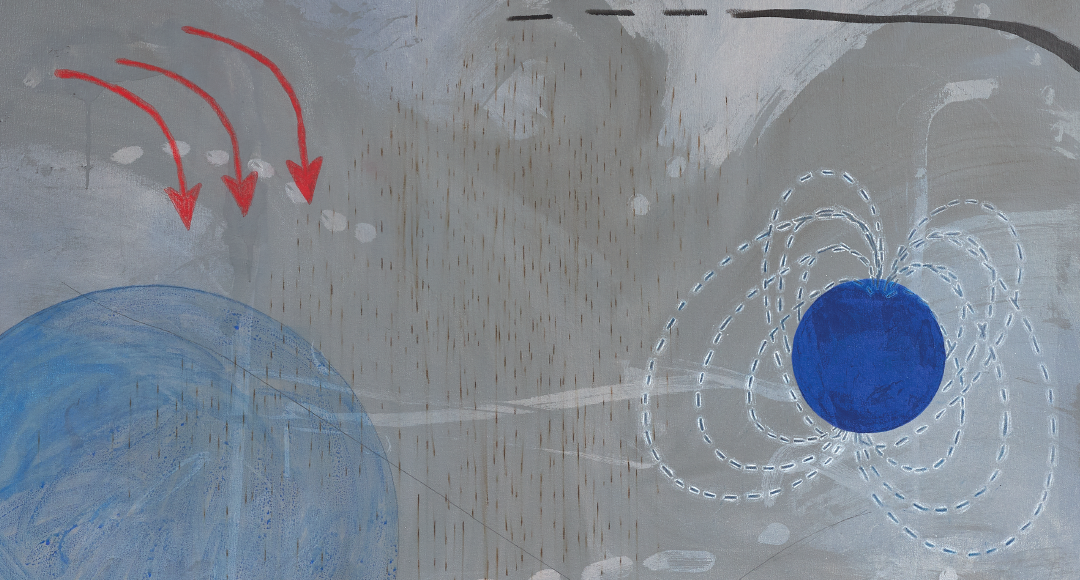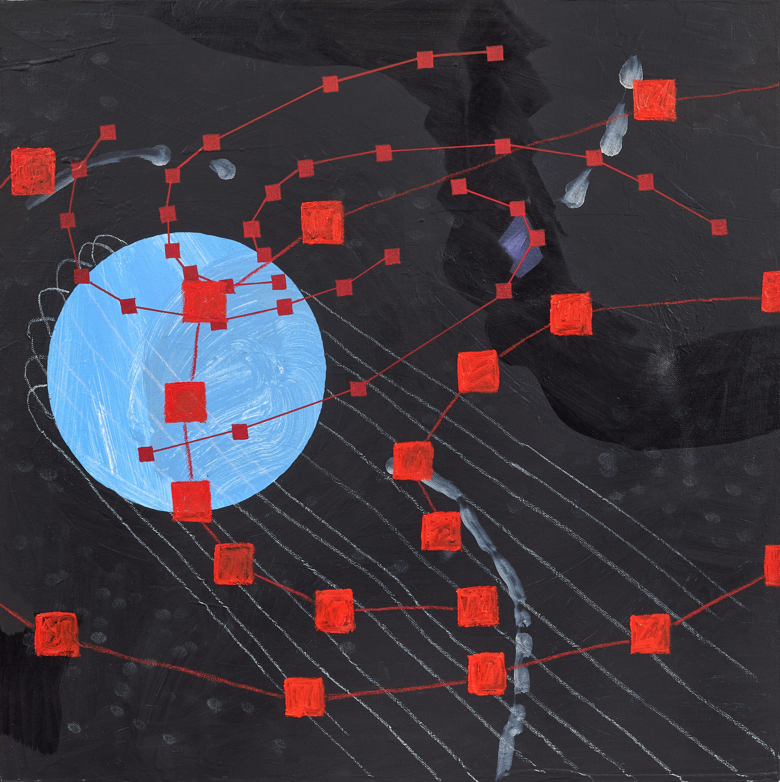 Like Edward Makuka Nkoloso, the Zambian revolutionary who simulated the training of an amateur troupe of astronauts to imagine an anticolonial, anticapitalist Space Race in 1964, and Sun Ra, the pioneering electronic musician who used experimental sound to envision emancipatory voyages to outer space in his synth track “Astroblack” in 1973, Adkins’ dynamic interplay of floating orbs, sprawling brushstrokes, granular textures, found objects, and muted palettes—peppered with splashes and details in cobalt blue, fiery red, golden yellow, and mossy green—visualizes her dramatic leaps between the archival and prophetic.